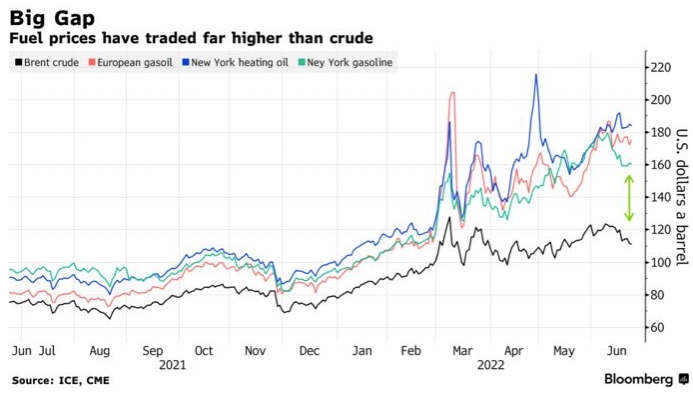 Продукты нефтепереработки, от бензина до дизельного топлива, сейчас являются горячими точками нефтяного рынка, и большой вопрос во втором полугодии заключается в том, сможет ли спрос поддерживаться на фоне стремительного роста цен. Коктейль из топливных субсидий, поддерживающих потребление на плаву, вместе с ограниченными мощностями по переработке нефти привел к ралли, опережающему цены на нефть. Американский бензин по цене 5 долларов за галлон привлек внимание политиков, что может спровоцировать политические действия в преддверии ноябрьских промежуточных выборов.