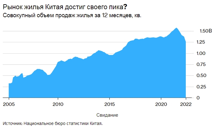 Рынок жилья Китая достиг своего пика? Совокупный объем продаж жилья за 12 месяцев, кв. Источник: Национальное бюро статистики Китая.