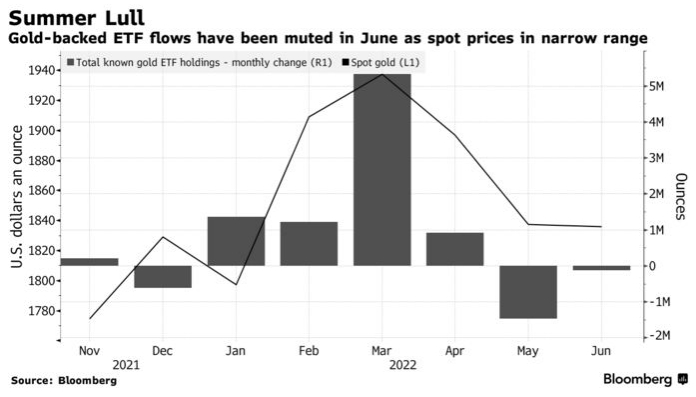 Потоки ETF, обеспеченные золотом, в июне были приглушены, поскольку спотовые цены находятся в узком диапазоне