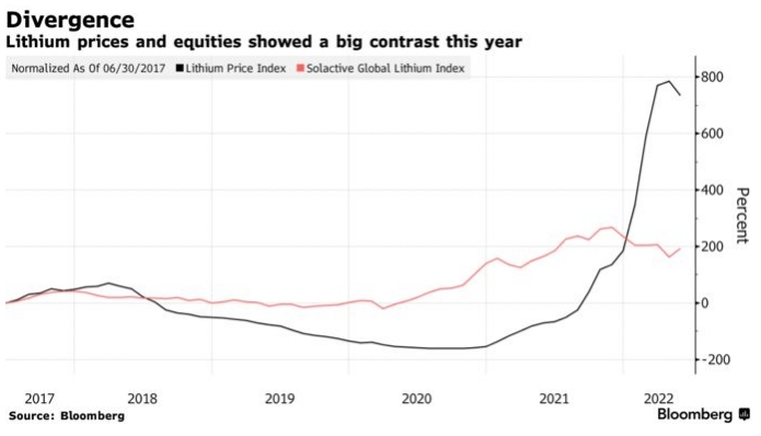 Цены на литий снова растут после короткой паузы в еще более стремительном ралли за последние 18 месяцев. Жизненно важный компонент аккумуляторов для электромобилей может продемонстрировать дальнейший рост в оставшейся части 2022 года, поскольку спрос на крупнейшем в мире рынке электромобилей оживится после ограничений Covid-19, которые привели к замедлению производства и прекращению покупок автомобилей потребителями.