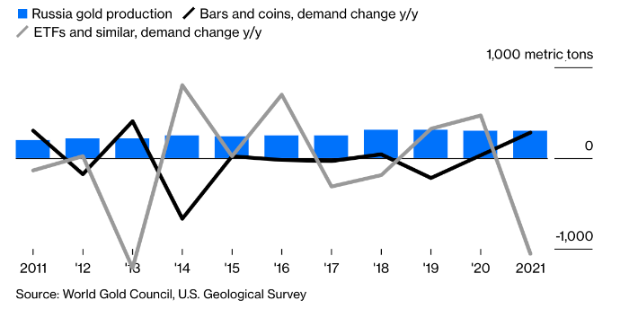 Приблизительно 300 метрических тонн золота, добываемые Россией, меркнут на фоне изменений инвестиционного спроса.