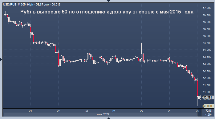 Российский рубль вырос в среду до самого высокого уровня более чем за семь лет, приблизившись к 50 по отношению к доллару впервые с мая 2015 года.