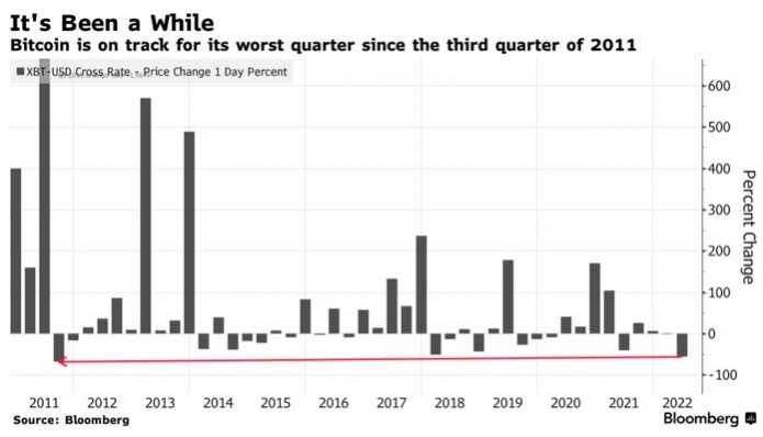 Биткоин находится на пути к худшему кварталу за более чем десятилетие, поскольку настроенный по-ястребиному центральные банки и череда громких крипто-крахов подрывают настроения.