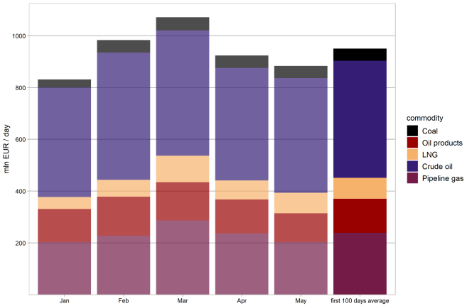 Доходы России от экспорта ископаемого топлива (черным – уголь, красным – нефтепродукты, оранжевым – СПГ, фиолетовым – сырая нефть, розовым – трубопроводный газ) в миллионах евро в день по месяцам (оценка CREA). Самый правый столбец – среднее значение за первые 100 дней с начала СВО. Источник: CREA