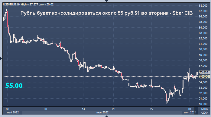 Рубль, похоже, обнаружил краткосрочный равновесный уровень возле 55 руб.$1 и будет консолидироваться сегодня около него в течение торговой сессии во вторник, полагают аналитики Sber CIB.