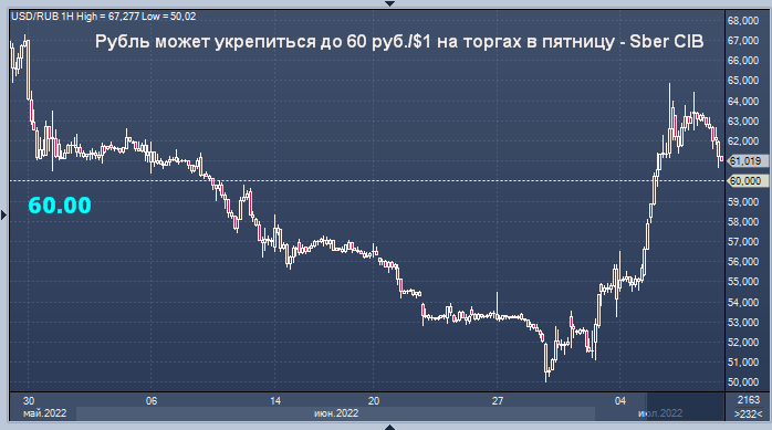 Рубль может укрепиться до 60 руб./$1 на торгах в пятницу, написали эксперты Sber CIB. Рубль в четверг стабилизировался и в конце дня сумел прибавить 2%, закрепившись ниже 62 руб./$1. Как полагают эксперты Sber CIB, коррекция рубля, возможно, завершилась, так как повышенный спрос на валюту насытился. По их прогнозам, благодаря укреплению нефти рубль в пятницу может приблизиться к 60 руб./$1.