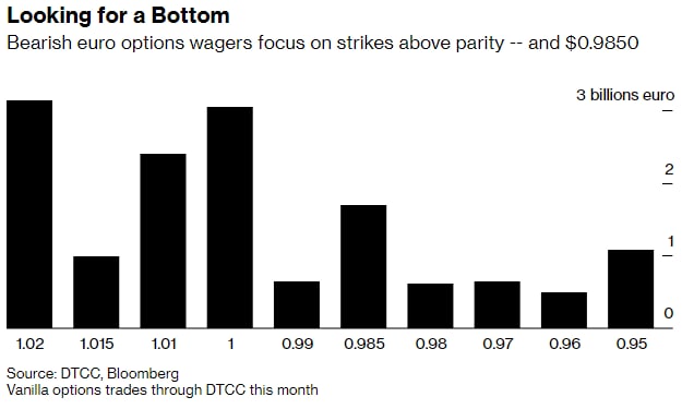 «1,00, вероятно, является самым большим психологическим уровнем на валютном рынке, и его прорыв выглядит все более вероятным», — сказали стратеги ING Groep NV во главе с Крисом Тернером. «Если бы 1,00 прорвали, мы ожидали бы, что волатильность резко возрастет и, скорее всего, будет гэп вниз по евро/доллару».