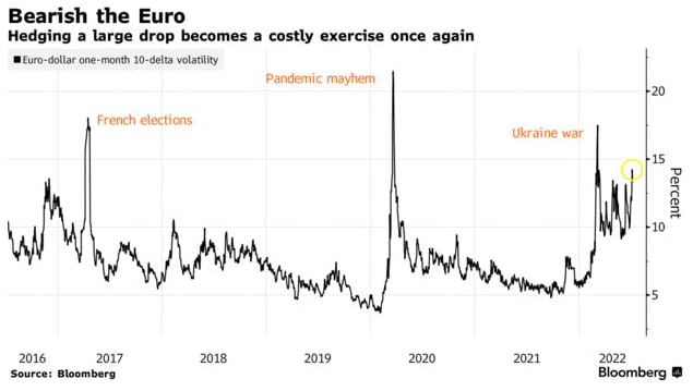 Согласно модели ценообразования опционов Bloomberg, вероятность того, что евро достигнет паритета в течение следующих 30 дней, составляет 52%, а вероятность того, что к концу года он достигнет 0,95 доллара, составляет один к четырем. Это делает хеджирование от дальнейших глубоких падений с начала СВО на Украине самым дорогостоящим.