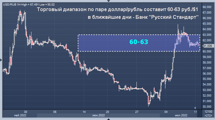 Торговый диапазон по паре доллар/рубль, скорее всего, составит в ближайшие дни 60-63 руб./$1, а по паре евро/рубль - 60,5-63,5 руб./EUR1, написал сегодня директор департамента операций на финансовых рынках банка "Русский Стандарт" Максима Тимошенко.