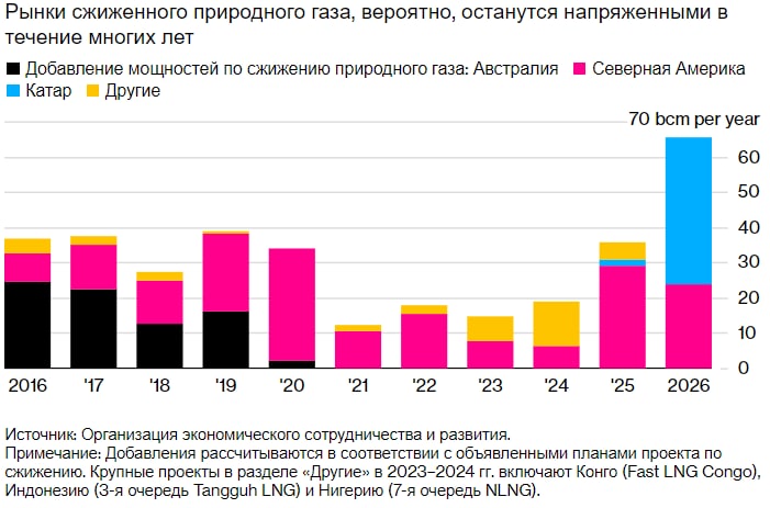 Примечание: Добавления рассчитываются в соответствии с объявленными планами проекта по сжижению. Крупные проекты в разделе «Другие» в 2023–2024 гг. включают Конго (Fast LNG Congo), Индонезию (3-я очередь Tangguh LNG) и Нигерию (7-я очередь NLNG).
