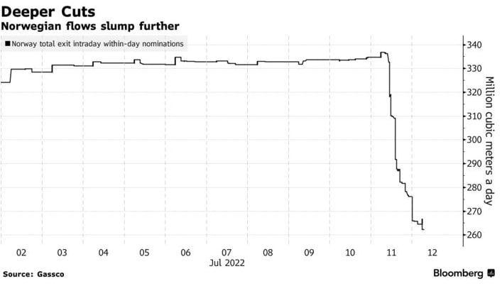 Спад поставок из Норвегии совпал по времени с остановкой ключевого российского газопровода «Северный поток» для планового ремонта. Все это происходит в то время, когда страны Европы спешат заполнить хранилища на зиму, а жара повышает спрос на электроэнергию для охлаждения домов. В Великобритании, где температуры значительно превышают сезонные нормы, в последние дни наблюдается более высокая, чем обычно, выработка электроэнергии на газовых электростанциях для этого времени года.