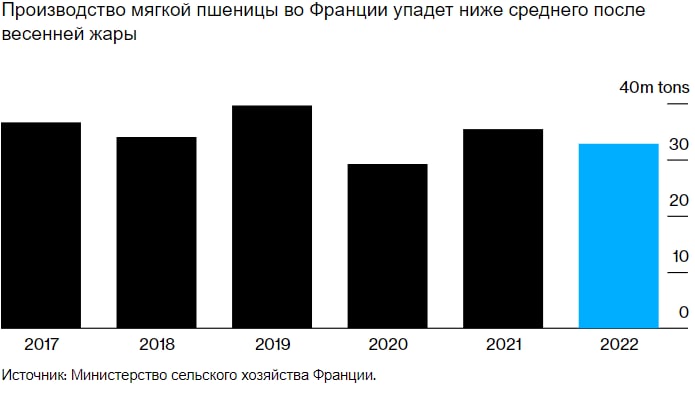 Производство мягкой пшеницы в стране упадет примерно на 7% до 32,9 млн тонн в этом году, что ниже среднего показателя за пять лет, сообщило во вторник министерство сельского хозяйства в своем первом прогнозе на сезон. Одна из самых сухих и теплых весен во Франции за всю историю наблюдений негативно сказалась на урожае в решающий период развития.