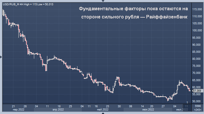 "Фундаментальные факторы пока остаются на стороне сильного рубля: на фоне сохраняющихся ограничений на движение капитала, профицит торгового баланса пока остается высоким, при этом мы полагаем, что его возвращение к прежним уровням вряд ли сможет произойти на горизонте текущего года. Впрочем, умеренное ослабление (в сторону 70-80 руб./$1 к концу года) возможно на фоне ожидаемой определенной коррекции экспорта (в том числе из-за начала частичного нефтяного эмбарго со стороны ЕС) и плавного восстановления товарного импорта.