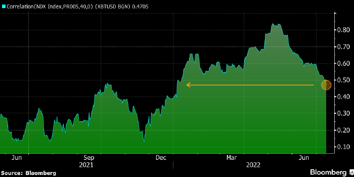 Корреляция между динамикой биткоина и индекса технологических компаний Nasdaq 100 опустилась до минимальных уровней с начала года ниже 0,50. Это означает, что биткоин и акции американских технологических компаний движутся синхронно реже, чем в 50% случаев.