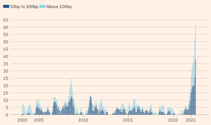 За три месяца до июня 55 центральных банков, отслеживаемых Financial Times, повысили процентные ставки 62 раза — не менее чем на 50 базисных пунктов. В июле они были повышены еще 17 раз на 50 базисных пунктов или более — это крупнейшее число значительных изменений ставок за все время с начала тысячелетия, которое перевесило последний глобальный цикл ужесточения монетарной политики перед глобальным финансовым кризисом.