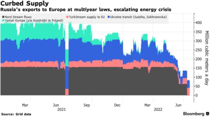 Президент России Владимир Путин указал, что потоки могут упасть до 20% уже на следующей неделе. В настоящее время работают только две турбины на компрессорной станции в России, которая питает трубопровод, и одна из них должна пройти техническое обслуживание в этом месяце. Потоки могут сократиться, если запасной компонент, отправленный из Канады после задержек, связанных с санкциями, не прибудет в Россию в ближайшее время.