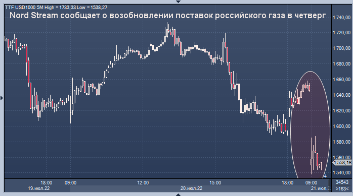 Цена газа в Европе снизилась после новостей о возобновлении поставок топлива из России по "Северному потоку -1", а вот евро практические не отреагировал. Его сегодня ждут более важные новости в лице ЕЦБ.