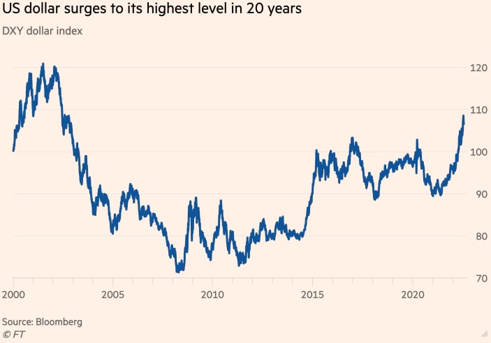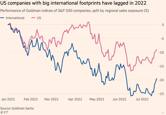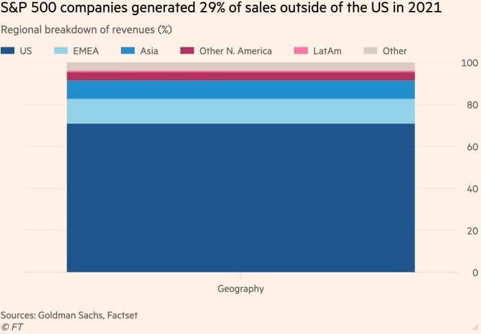 Сектор высоких технологий сильно зависит от доллара, учитывая присутствие отрасли за рубежом. По оценкам Goldman Sachs, 59% продаж технологических компаний, входящих в расчет S&P, были произведены за пределами США. Это намного выше, чем у средней американской публичной компании с большой капитализацией; группы S&P 500 в целом получили 29% своей выручки в размере 14 трлн долларов в 2021 году за границей.