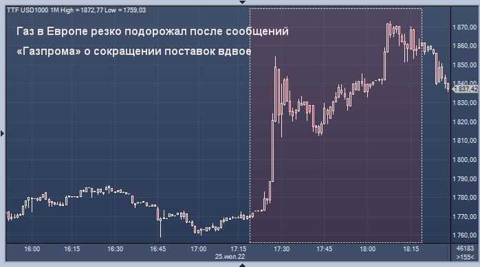 График цены ближайшего фьючерса на спотовый индекс газа TTF на бирже ICE Futures (в долларах США за тысячу кубометров) интервалами в 1 минуту