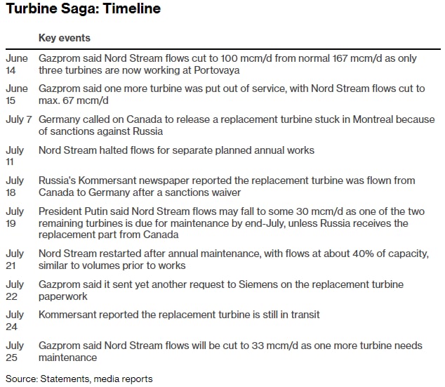 В прошлом месяце «Газпром» сократил поставки Nord Stream в два этапа, сославшись на проблемы с турбинами на компрессорной станции «Портовая» в России, от которой идет газ. Компания заявила, что эти проблемы были вызваны задержками ремонта производителем турбин Siemens Energy AG на фоне международных санкций против России, а также отключением некоторого оборудования по распоряжению российских регуляторов безопасности.