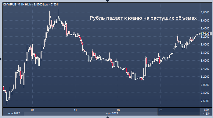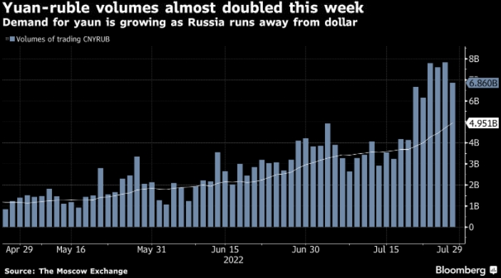 Но аппетит к юаню, а также превысившее прогноз снижение ставки на прошлой неделе, кажется, охлаждают ралли, которое опровергно утверждение президента США Джо Байдена о том, что санкции превратили рубль в «мусор». Валюта упала более чем на 16% в июле и должна прервать четырехмесячную серию потерь по отношению к доллару. Объем торгов юань/рублем в июле достиг 94 млрд юаней по сравнению с 54 млрд в июне, согласно расчетам Bloomberg, основанным на ежедневных данных Московской биржи на закрытие четверга.