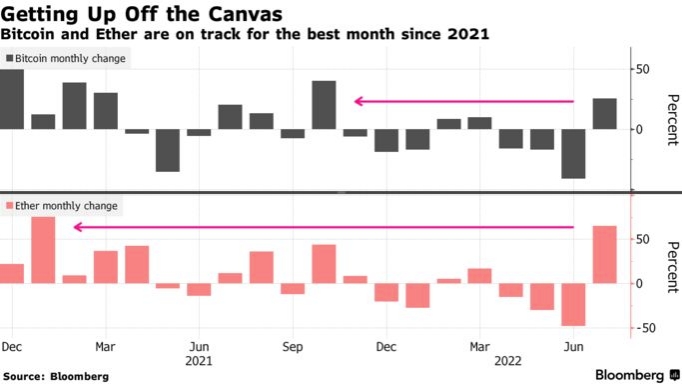 Биткойн и эфир, два крупнейших цифровых токена в мире, приближаются к своему лучшему месяцу с 2021 года на фоне возрождения аппетита к риску на мировых рынках и оптимизма по поводу обновления сети Ethereum.