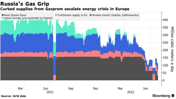 Ограничения подняли цены до самого высокого уровня с начала марта, в первые недели конфликта России и Украины. Стремительно растущие счета за электроэнергию раздули инфляцию, угрожая ввергнуть некоторые части континента в рецессию, поскольку страны спешат накапливать запасы газа перед зимними месяцами.