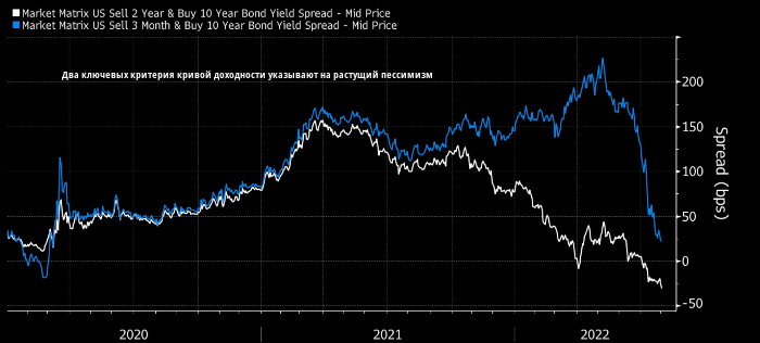 Менее пристально отслеживаемый, но более надежный индикатор рецессии, поскольку он имеет тенденцию к инверсии только после повышения краткосрочных ставок и действительно неизбежного экономического спада, — это кривая доходности облигаций за три месяца / 10 лет. (Она каким-то образом совершила инверсию накануне карантина из-за Covid в феврале 2020 года). Большую часть времени в последние 12 месяцев они двигались в разных направлениях, но теперь трехмесячная кривая резко выровнялась: в пределах 21 базисного пункта от инверсии.