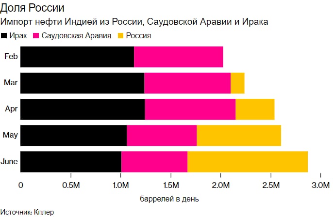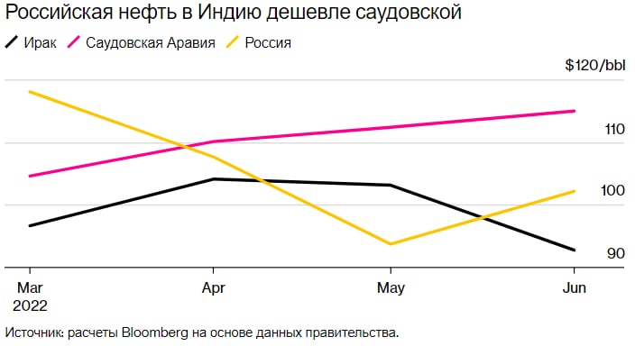 Российские партии нети были дешевле саудовской нефти с апреля по июнь, а в мае скидка увеличилась почти до 19 долларов за баррель, согласно расчетам Bloomberg, основанным на данных правительства Индии. Россия превзошла королевство, став вторым по величине поставщиком в Индию в июне, уступив только Ираку.