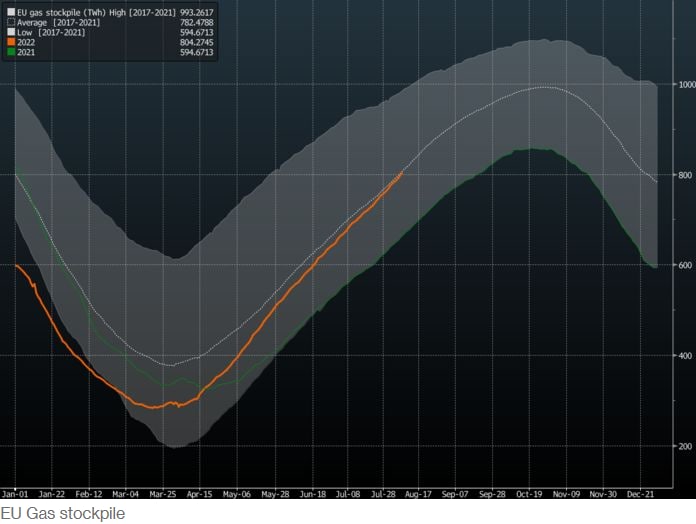 Сезон закачки газа в Европе должен закончиться на уровне примерно в 103 миллиарда кубометров в хранилищах, которые «должны обеспечить достаточную изоляцию, даже если российский газ больше не будет поступать». С начала июля запасы росли быстрее, чем в среднем за пять лет, и в предыдущие два месяца их накопление редко опускалось ниже этого ориентира.