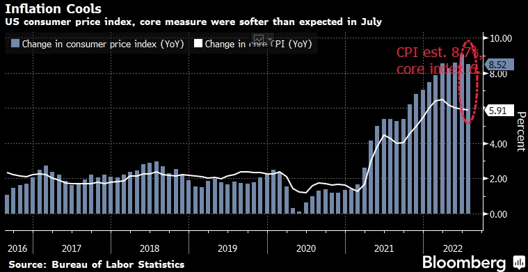 Инфляция в США замедлилась в июле больше, чем ожидалось, отражая более низкие цены на энергоносители, что может ослабить давление на Федеральную резервную систему, чтобы она продолжала агрессивно повышать процентные ставки. Индекс потребительских цен вырос на 8,5% по сравнению с прошлым годом, остыв после июньского роста на 9,1%, который был самым большим за четыре десятилетия, показали данные Министерства труда в среду.