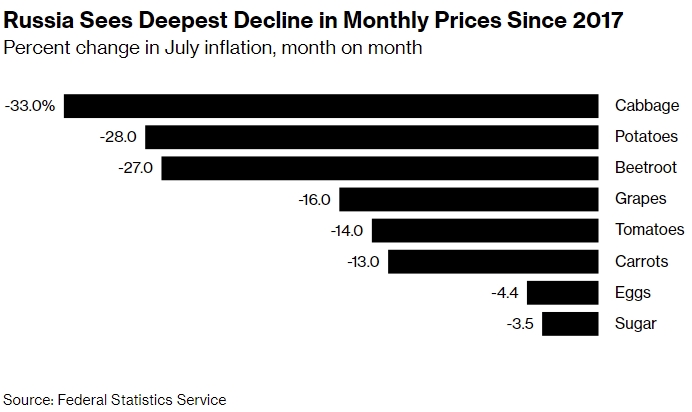 По данным Федеральной службы государственной статистики в среду, замедляющаяся третий месяц подряд годовая инфляция упала до 15,1% в июле с 15,9% в июне. Средний прогноз в опросе Bloomberg 16 экономистов был на уровне 15,3%.