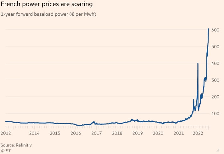 Немецкая электроэнергия с поставкой в следующем году, эталонная европейская цена, в четверг выросла более чем на 5% до рекордных 455 евро за мегаватт-час. Это в пять раз выше, чем цена в это время в прошлом году. Эквивалентный французский контракт вырос на 4%, впервые превысив 600 евро за мегаватт-час.