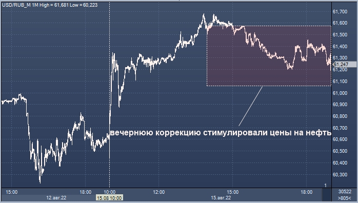 Курс в ходе торгов падал на 1,8% до 61,68, но к вечеру скорректировался и падение по итогам дня было чуть менее значительным благодаря коррекции в ценах на нефть.