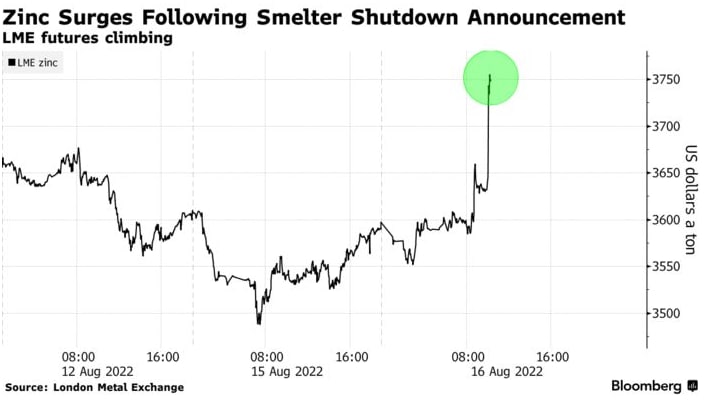 Цинк резко вырос после того, как один из крупнейших металлургических заводов Европы объявил об остановке производства в следующем месяце, поскольку энергетический кризис на континенте угрожает нанести ущерб тяжелой промышленности.