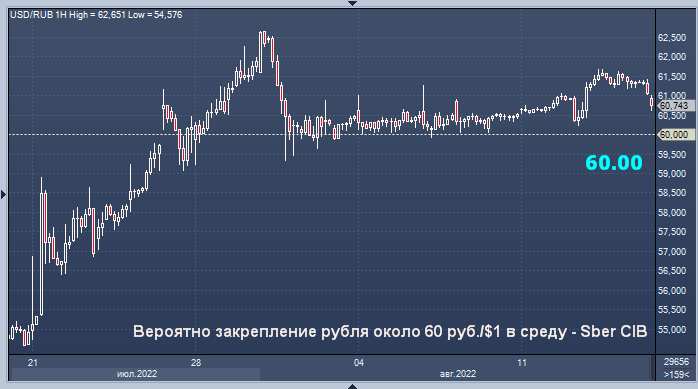 Вероятно закрепление курса рубля около уровня 60 руб./$1 на торгах в среду (высокий спрос на валюту, а средний ежедневный объем торгов составляет около $5 млрд, скорее всего, близок к насыщению), написали эксперты Сбербанка.