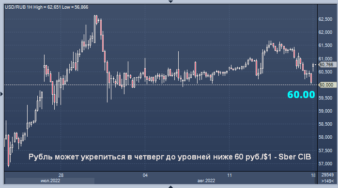 Рубль может укрепиться в четверг до уровней ниже 60 руб./$1, а доходности ОФЗ могут снизиться ещё на несколько базисных пунктов, полагают специалисты Сбербанка.