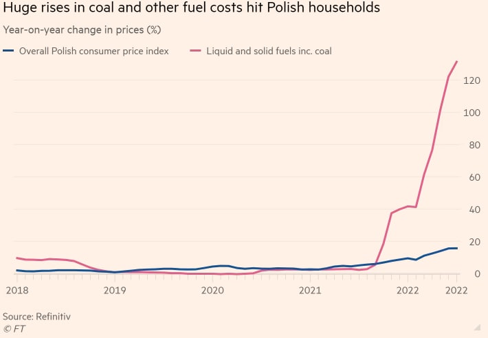 Угольный кризис начался, когда экономика Польши сократилась на 2,3% во втором квартале по сравнению с предыдущим кварталом, что повышает вероятность рецессии. В преддверии выборов в следующем году, исход которых может зависеть от того, как Польше удастся справиться с экономическими последствиями конфликта на Украине, правое коалиционное правительство недавно объявило о нескольких экстренных шагах, чтобы облегчить беспокойство избирателей по поводу отопления домов.