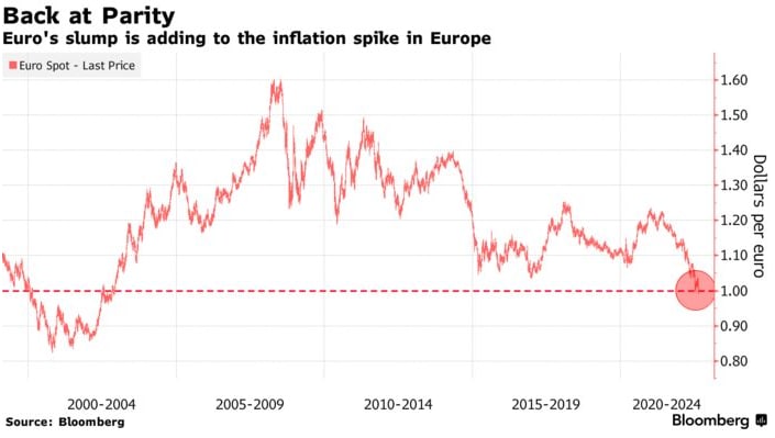 Экономические опасения также подпитывают колебания обменного курса, поскольку трейдеры делают ставку на то, что они ограничат способность Европейского центрального банка к ужесточению, что приведет к тому, что он еще больше отстанет от агрессивного наращивания темпов Федеральной резервной системы. Растущая разница в процентных ставках приносит пользу доллару, и текущая тенденция в такой же степени является историей силы доллара. Согласно индексу Bloomberg, по отношению к корзине мировых валют евро близок к самому низкому уровню с 2015 года.