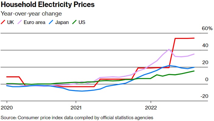 США начинают осознавать проблему, которая преследует другие части мира с прошлого года. В Германии правительство ввело налог в размере 296 долларов на домохозяйства для оплаты природного газа, поскольку Россия сокращает потоки энергоносителей в Европу после начала СВО в Украине. В Великобритании государственная поддержка счетов за электроэнергию увеличилась вдвое, до 482 долларов на каждое домохозяйство, начиная с октября, но цены растут так быстро, что поддержки может быть недостаточно. Более 100 000 человек подписали обязательство от группы кампании Don't Pay UK отменить свои платежи за энергию прямым дебетом, начиная с октября.