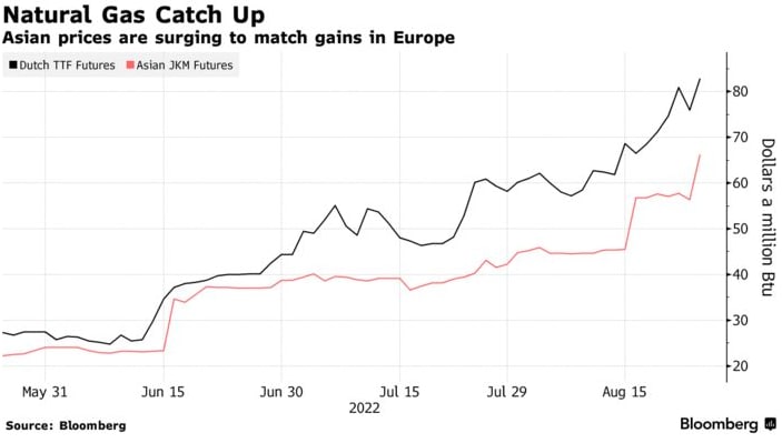 Континент в значительной степени зависит от импорта сжиженного природного газа, чтобы заполнить пробел, оставленный Россией, но конкуренция за топливо с Азией усилилась после относительного затишья в начале лета. Азиатские цены также растут, поскольку коммунальные службы спешат запастись газом в преддверии зимы.