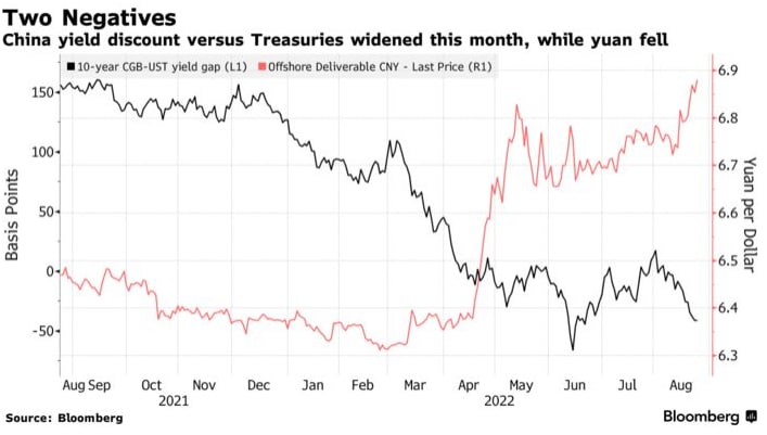 Дисконт доходности Китая по отношению к трежерис увеличился в этом месяце, а курс юаня упал
