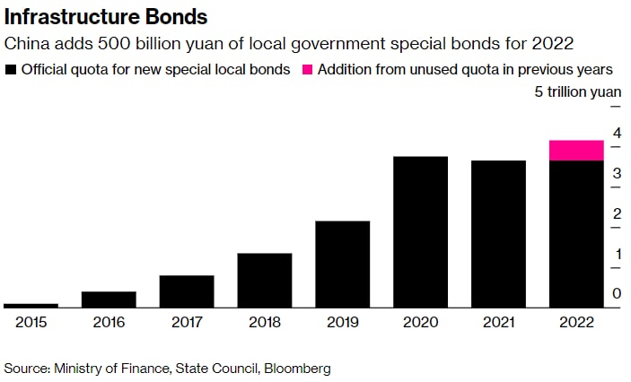 Инфраструктурные облигации. Китай добавляет 500 млрд юаней специальных облигаций местных органов власти к 2022 году. Источник: Министерство финансов, Госсовет, Bloomberg.