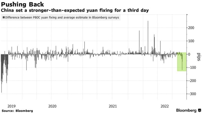 Народный банк Китая установил фиксинг на 56 пунктов выше, чем средняя оценка в обзоре Bloomberg. Это произошло после того, как исправление в четверг было на 120 пунктов выше прогноза, что является самым большим разрывом с февраля 2020 года. Хотя движение в четверг помогло оффшорному юаню отыграть недавние потери, он остается второй худшей валютой в Азии в этом квартале.