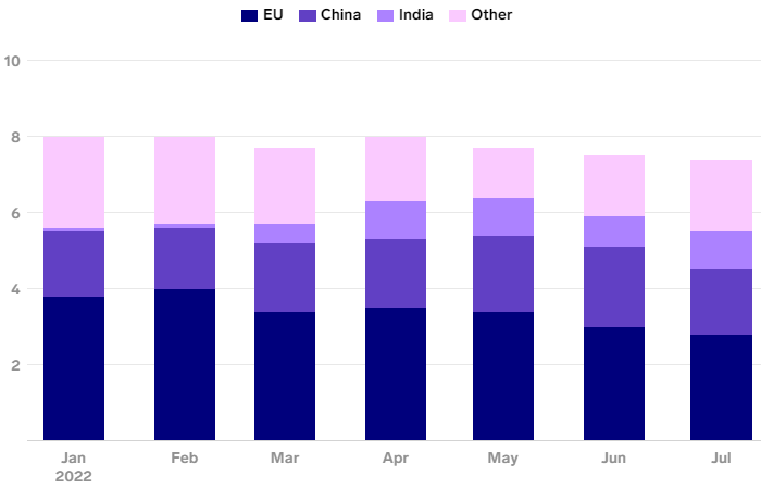 Покупки Индией российской нефти сыграли большую роль. Здесь ее импорт рос пять месяцев подряд, а затем немного снизился в июне. Страна по-прежнему потребляет 1 миллион баррелей российской нефти в день, что на 900% больше, чем в феврале.