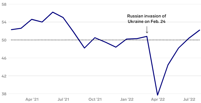 Уолл-Стрит не видела ничего, кроме боли для российского производственного сектора и сектора услуг в связи с введением западных экономических санкций. После начала СВО российский композитный индекс менеджеров по закупкам, который отслеживает тенденции в двух секторах, резко снизился с 50,8 в феврале до 37,7 в марте (значение выше 50 указывает на рост, а ниже 50 — на спад).