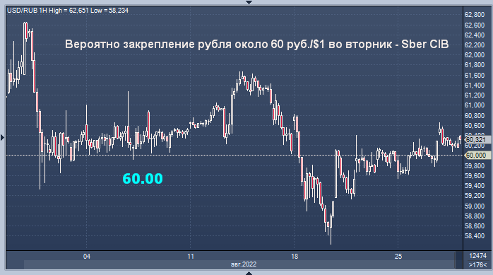 Вероятно закрепление курса рубля около уровня 60 руб./$1 на торгах во вторник, считают аналитики Sber CIB.