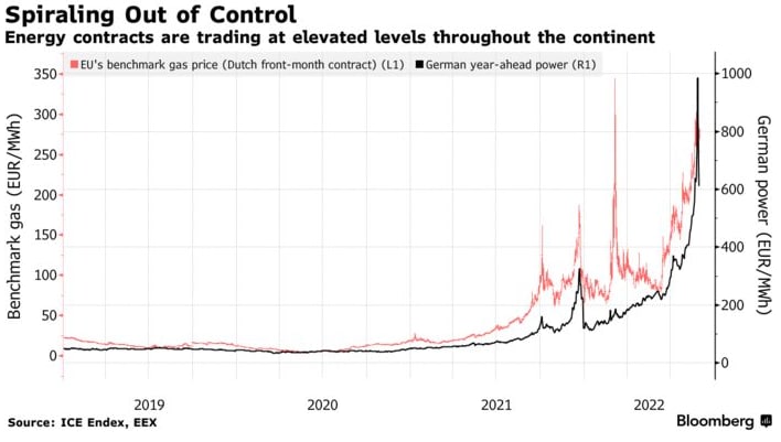 Commerzbank AG предупредил о «серьезной рецессии» в Германии, если Россия полностью прекратит поставки газа. Хотя страна является одной из наиболее уязвимых, риски распространяются на Австрию и Италию, говорится в отчете Fitch Ratings Inc. Некоторые другие страны также получают российский газ через своих соседей, и сокращение поставок может нарушить эту торговлю.