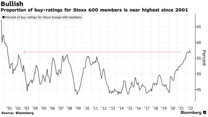 Доля оптимистичных прогнозов Stoxx 600 почти самая высокая с 2001 года.