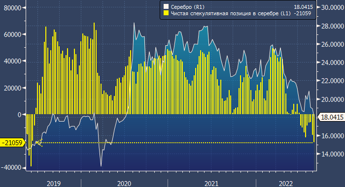 Объем длинной спекулятивной позиции по серебру опустился до минимального значения за последние два года, а объем короткой — поднялся до максимального значения за последние пять недель.